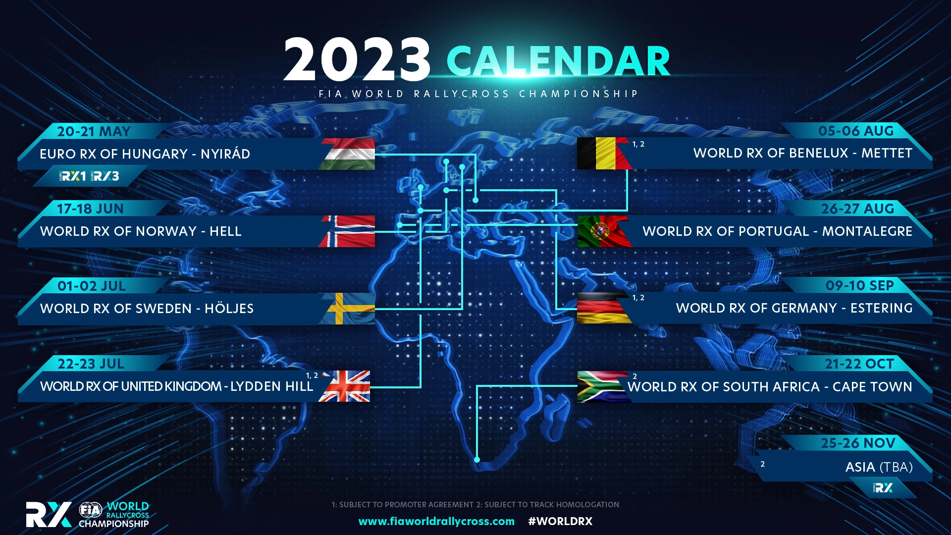Rallycross Promoter GmbH İcra Direktörü Arne Dirks şunları söyledi: “Rallycross'un en iyilerini temsil ettiğine inandığımız ve son aylarda perde arkasında büyük bir çabaya konu olan 2023 Dünya RX takvimini sunmaktan mutluluk duyuyoruz. Son sezonlardan açıkça biraz farklı görünüyor ve nihayet kanatlarımızı açıp yeniden Avrupa dışına çıktığımız için çok mutluyuz. Bu harika şampiyonanın organizatörü olarak görevi devraldığımızdan beri, World RX'i hevesli Güney Afrikalı hayranların önünde sergilemek için Cape Town'a dönmeye kararlıyız ve seriye Asya'da yeni bir etkinlik eklediğimiz için çok heyecanlıyız. Aynı zamanda Lydden Hill, Mettet ve Estering'deki üç karizmatik Avrupa sahasının yeniden tanıtılması, sporun elektrikli geleceğini kucaklarken rallikrosun zengin mirasını ve geleneklerini kutlama arzumuzu yansıtıyor. Benzer şekilde, bu yıl Hell, Höljes, Montalegre ve Nyirád'da görülen büyük kalabalıklar, bu turların kalıcı cazibesinin kanıtıdır. Yarışa gitmek için sabırsızlanıyoruz!” | WRX Medya, 7 Aralık 2022 :