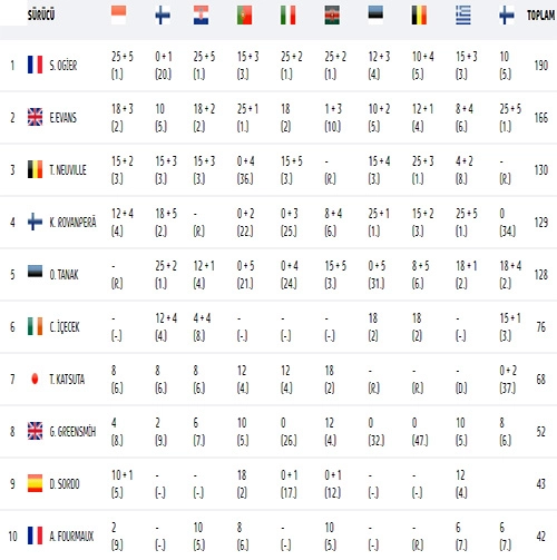 Thierry Neuville’yi 36 puan gibi açık ara farkla ardında bıraktı. İki Toyota pilotunun rahat 1-2’nciliğinin ardından podyumun 3’ncü basamağı için zorlu bir rekabet yaşanıyor. 130 puanla şimdilik 3’ncü görünen Neuville’nin sadece 1 puan ardından Toyota’nın bir başka pilotu, genç Finli Kalle Rovanpera geliyor. Neuville gibi Finlandiya’dan puansız dönen Kalle’nın de sadece 1 puan ardında Estonyalı şampiyon rallici