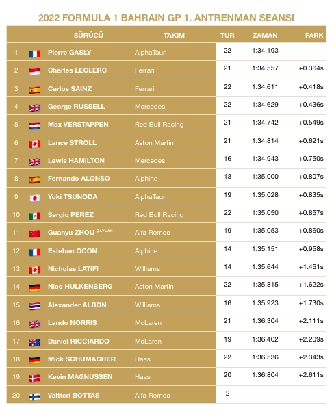 2022 Formula 1 sezonu bugün Bahreyn'de yapılan antrenman seanslarıyla start aldı. İlk antrenman seasını Alpha Tauri pilotu Pierre Gasly zirvede tamamlarken, Ferrari pilotları Charles Leclerc ve Carlos Sainz onu takip etti. Mercedes ile ilk sezonuna başlayan George Russell 4'üncü sırada, Lewis Hamilton ise 7'nci sırada bitirdi. Son dünya şampiyonu Max Verstappen 5'inci sıradayken Bottas ise zaman kaydedemedi. Geçtiğimiz günlerde Covid-19'a yakalanan Sebastian Vettel'in yerine bu hafta Aston Martin koltuğuna oturacak isim Nico Hulkenberg olacak. İkinci antrenman seansı bugün Türkiye saati ile 18:00'de yapılacak.