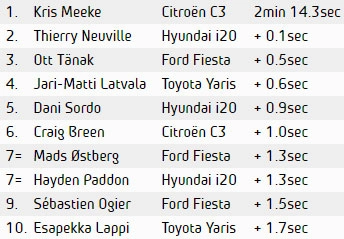 Thierry Neuville'den 1 salise daha hızlı çıktı. Hyundai i20’i ile Neuville ise Ott Tanak'ın 4 salise geride kaldı. Üçlü, en iyi zamanlarını etabı dördüncü geçişlerinde kaydettiler.