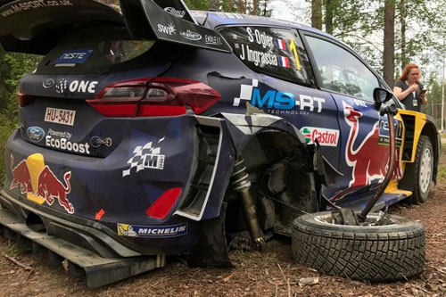 Sebastien Ogier, Ford Fiesta'sı ile rallinin bugünkü (cumartesi) Jukojarv özel etabında ağaçlara çarptı ve yarış dışı kaldı. Kazada yaralanan kopilotu