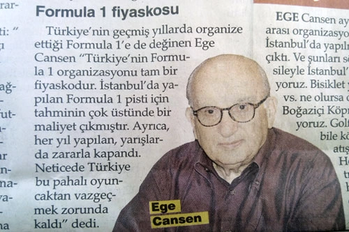 , ?Türkiye?nin Formula 1 organizasyonu tam bir fiyaskodur? dedi. İstanbul?da yapılan Formula 1 pisti için tahminin çok üstünde bir maliyetin çıktığına işaret eden Cansen,
