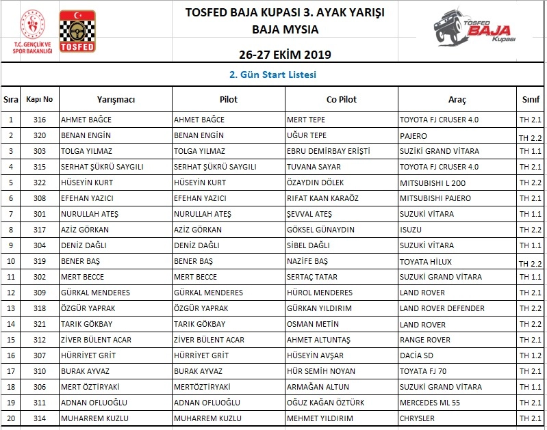 Tarık Gökbay ise 50 dakika ceza alarak klasmanda gerilere düştüler. İlan edilen kesin sonuçlara göre ikinci güne Mert 11, Tarık ise 14'ncü olarak başlayacaklar. Baja Mysia'da ilk gün liderlik Toyota FJ Cruser ile yarışan