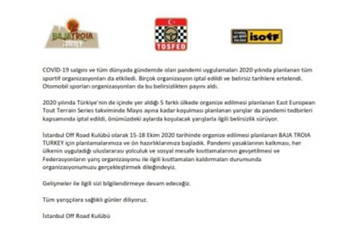 İsoff) yaptığı duyuruda, Baja Troia hazırlıklarına başladıklarını, kısıtlamaların gevşetilmesi ve yasakların kalkması halinde yarışı gerçekleştirmeyi dilediklerini açıkladı.