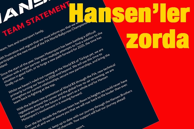 “Hansen Takım Açıklaması; Finlandiya'da düzenlenecek FIA Dünya Rallikros Şampiyonası'nın bir sonraki ayağına katılamayacağımızı bildirmekten büyük bir üzüntü ve hayal kırıklığı duyuyoruz. Yıl başından beri Hansen Motorsport, önemli bir ortakla zor bir durumla mücadele ediyor. Duruma iyi niyetle bir çözüm bulmak veya 2025 için yeni bir yol haritası çizmek için birçok girişimde bulunduktan sonra, nihayet zaman doldu. Henüz Türkiye Dünya RX'inde yarışmayı göz ardı etmemiş olsak da öncelikle 2026 ve sonrasına odaklanıyoruz. Bu zamanı mevcut ilişkilerimizi güçlendirmek, yeni ortaklıklar kurmak ve takımı zirvede mücadele etmeye geri döndürmek için kullanacağız. FIA aracılığıyla Dünya RX'in muhteşem yeni tanıtımı, yaklaşan yeni teknik düzenlemeler ve küresel ücretsiz yayın akışıyla, sporun geleceği ve Hansen Motorsport'un bundan sonraki süreçteki rolü için çok heyecanlıyız. Son on yılda Hansen ekibi hayal bile edemeyeceğimiz zirvelere ulaştı ve her zamankinden daha güçlü bir şekilde hayata döneceğimizden emin olabilirsiniz. Bu arada, yolculuğumuzu Hansen Kardeşler Podcast'i ve sosyal medya kanallarımız aracılığıyla takip edin. Desteğiniz, önümüzdeki yolculuğumuza güç katacak! Sürekli desteğiniz için teşekkür ederiz.” | 15 Ağustos 2025 : 20.20