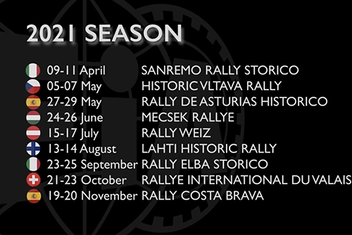 2021 FIA Historik Ralli Şampiyonası 9 ayaktan oluşuyor. 9-11 Nisan’da Sanremo Rallisi Storico ile başlayacak olan şampiyonada sırasıyla 5-7 Mayıs'ta Historik Vltava Rally, 27-29 Mayıs'ta Rallye De Asturias Historico, 24-26 Haziran'da Mescek Rallye, 15-17 Temmuz'da Rallye Weiz, 13-14 Ağustos'ta Lahti Historic Rally, 23-25 Eylül'de Rallye Elba Storica ve 21-23 Ekim'de Rallye International Du Valais rallileri yapıldıktan sonra 19-20 Kasım’da Rallye Costa Brava ile tamamlanacak. |