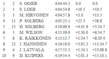 Sebastien Ogier Citroen DS3 WRC'si ile Akropol Rallisi kazanarak, dünya şampiyonasında liderliğini koruyan takım arkadaşı Sebastien Loeb ile farkını 8 puan azalttı.. Yakın bir mücadele halinde geçen Yunanistan'ın podyum rekabetinde Citroen'dan takım arkadaşının 10 saniye ardında 2'nci olan Loeb, şampiyonadaki liderliğini korudu. 2008 yılında dünya gençler şampiyonu olan Ogier, Portekiz ve Ürdün'den sonra bu sezon üçüncü kez bir WRC rallisini kazanıyor. Ford Fiesta RS WRC ile Loeb'ün sadece 3 saniye ardından podyumda 3'ncülüğü elde eden Ford Pilotu Mikko Hirvonen, şampiyonada 15 puan farkla lider Loeb'ün ardından 2'nciliğini sürdürdü. IRC'nin son şampiyonu Hanninen ise Yunanistan'da WRC'lerin ardından 8'nci sırada finiş gördü.