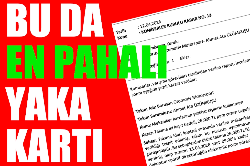 ‘Mekaniker kartlarının yetkisiz kişilerin kullanması’ gerekçesi ile verilen ceza ile ilgili olarak alınan kararda şöyle denildi; “Takıma iki kayıt bedeli, 26.000 TL para cezası uygulanmasına karar verilmiştir. Sebep: Takıma idari kontrol sırasında verilen mekaniker kartının mekaniker olmayan kişiye verildiği tespit edilmiş, takım bu hususta uyarılmasına rağmen uyarıları dikkat almadığı görülmüştür. Bu sebeplerden ötürü takıma 26000 TL iki kayıt bedeli ceza uygulanmasına karar verilmiş olup tutarın 13.04.2026 saat 09:00’a kadar Tosfed hesabına ödendiğini gösterir dekontun sportif direktörlüğün elektronik posta adresine iletilmesi gerekmektedir.”