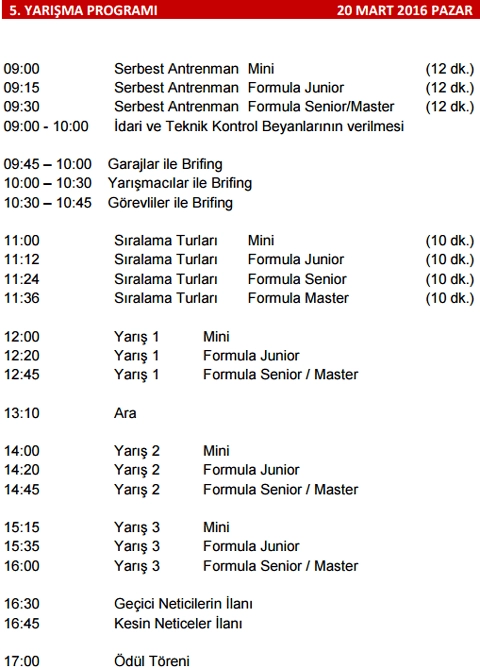 Süleyman Kolot[/caption] Kartingte sezon, 20 Mart Pazar günü Körfez’de açılacak. Bursa kulübü tarafından düzenlenen yarışa 4 farklı kategoride toplam 23 sporcu katılacak. Pazar günkü programa göre, 930 metre uzunluğundaki Körfez Karting Yarış Pisti’nde Formula Senior ve Master’lar 21 turdan 3 yarış sonunda toplam 63 tur; Formula Junior’lar 18’er turdan 3 yarış sonunda toplam 54 tur; Mini’ler ise 14’er turdan 3 yarış sonunda toplam 42 tur olarak mücadele edecekler..