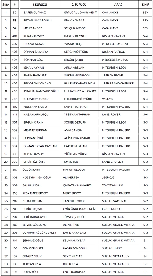 Hafta sonu Denizli'nin Merkezefendi ilçesinde yapılacak olan Türkiye Offroad Şampiyonası 2.ayak yarışı için 5 kategoride toplam 34 kayıt geldi. Denizli kulübü tarafından resmi siteden yapılan açıklamaya göre yarışta 3 SSV, 5 S1, 5 S2, 10 S3, 11 S4 olmak üzere toplam 34 ekip kayıt yaptırdı. Yarışta cumartesi günü orman etabı, pazar günü ise seyirci etabı geçilecek. | 18 Ağustos 2021 :