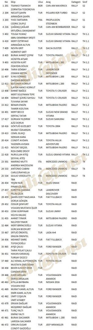 9. Trans Anatolia Rally Raid maratonunun kayıt listesi belli oldu. 41 motor ve 46 otomobil, kamyon, utv olmak üzere toplam 87 ekibin mücadele edeceği 2300 km'lik zorlu maraton 24 Ağustos Cumartesi günü Abant'tan start alacak ve 31 Ağustos pazar günü Göbeklitepe'de tamamlanacak. 9 Ağustos 2019 :