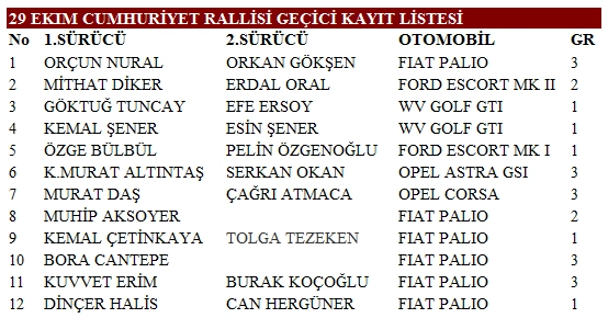Ege Asal Metal'dan büyük destek.. Edinilen bilgiye göre, 29 Ekim Cumhuriyet Rallisi için İzmirli amatör yarışçılar kulübe kayıt formlarını ulaştırmaya başladılar. Yarışa bir hafta kala şimdiden 12 otomobilin katılacağının belli olması, mahalli organizasyon niteliği de göz önüne alındığında oldukça dikkat çekici. Yarışa katılacak olan ekipler arasında, İsabeyli Belediye Başkanı