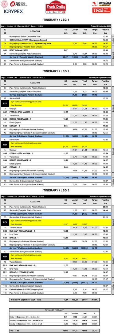 Türkiye Ralli Şampiyonası’nda (TRŞ) heyecan kaldığı yerden devam ediyor. Sezonun 4’üncü rallisi olan Eskişehir Rallisi önümüzdeki hafta Eskişehir kulübü tarafından gerçekleştirilecek. 13 Eylül Cuma günü Odunpazarı Belediyesi önünde kurulacak olan tak’tan seramonik start alınacak olan rallide aynı gün 8.67 km’lik seyirci etabı yapılacak. Rallide ikinci gün (cumartesi) üç farklı etap ikişer kez geçilerek 129 km’si özel etap olmak üzere toplam 194 km katedilecek. Son gün olan (pazar) ise, iki farklı etabın ikişer kez geçilmesinden sonra ralli akşam üstü Eskişehir Atatürk Stadumundaki servis parkında finiş görecek olan ralliciler, üç günde toplam 120 km’lik 11 özel etapta rekabet etmiş olacaklar. | 5 Eylül 2024 : 12.00