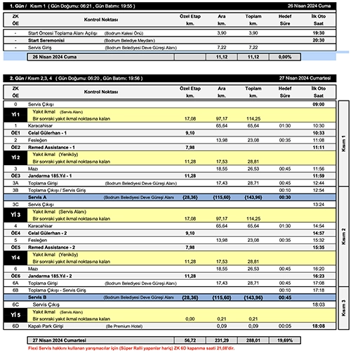 Türkiye Ralli Şampiyonasında sezonun üçüncü ayağı 26-28 Nisan’da Bodrum’da yapılacak. Karya Otomobil Sporları Kulübü tarafından gerçekleştirilecek olan rallide yol keşfi, teknik kontrol ve seramonik start Cuma günü, Mazı ve Fesleğen bölgelerinde toplamı 56.72 km’lik asfalt altı özel etapta ilk ayak cumartesi günü, Kızılağaç ve Extrim bölgelerinde toplamı 60 km bulan altı özel etabın yer aldığı ikinci ve son ayak ise pazar günü yapılacak. Türkiye Ralli ve Türkiye Historik Ralli Şampiyonalarının yanısıra Celal Gülerhan Tosfed Kupası'na da puan verecek olan ralli pazar günü finiş görecek. | 13 Nisan 2024 : 09.30