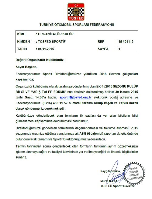 Federasyon Sportif Direktörlüğünce yürütülen 2016 sezonu çalışmaları kapsamında, organizatör kulüp olarak Federasyonca gönderilmiş olan ek-1 /2016 sezonu kulüp bilgi ve yarış talep formunun eksiksiz doldurulmuş halinin 30 Kasım 2015 tarihi Saat: 14:00’a kadar, elektronik posta adresine ve federasyonunun faksına kulüp kaşeli ve yetkili imzalı olarak gönderilmesinin gerektiği” hatırlatıldı ve yazı şöyle sürdürüldü;