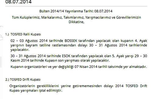 ?organizatörlerin gerekliliklerini yerine getirememesinden dolayı 2014 Tosfed Drift Kupası yarışmaları iptal edilmiştir? açıklaması ile konu geçiştirildi. Bu açıklama, federasyonun kupayı iptal etmesinde aslında driftçi kulüplerle arasındaki sorunlar olduğu gerçeğini gün yüzüne çıkardı.