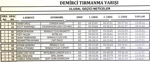 en iyi çıkış zamanı ile toplamda üç kupa ile eve döndü. Manisa’nın Kütahya sınırındaki en rakımlı köyü olan Demirci’de ilçe belediyesinin desteği ile Ege Kulübü tarafından düzenlenen yarışa 24 kayıt geldi, cumartesi günkü teknik kontrol sonrası 23 otomobil start alarak parkurdaki rekabete katıldı. Açık ama sabah