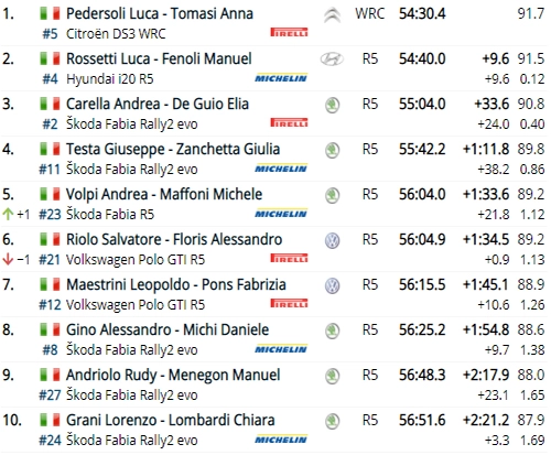 2021 WRC İtalyan Şampiyonası'Nın ilk ayağı Rallye Elba’da güvenlik nedeniyle son etap iptal edildi, Luca Pedersoli-Anna Tomasi Citroen DS3 WRC ile 1’nci oldular. Toskana klasiği olan rallide iki günlük yarış boyunca her özel etap keyif verdi. Luca Rossetti-Manuel Fenoli Hyundai i20 R5 ile Pedersoli-Tomasi'nin ardından 2’nci sırada finiş gördüler. Rossetti'nin sağ arka fren sorunları nedeniyle iki ekip arasında 2 saniyeye kadar düşen fark, 9,6 saniye olarak noktalandı. Rossetti, İtalya 6’ncı Bölge Aci Sport Zone Ralli Kupası’nın ikinci ayağı olan yarışta 1’ncilik puanları kazandı. Skoda Fabia R5 ile Giulia Zanchetta Zone Rally Cup’ta ise Rossetti'nin hemen arkasında ikinci sırayı almaya başardı. Elba'dan Andrea Volpien iyi yerel sürücü olurken, Fabia R5'te özellikle gece etaplarında ilginç zamanlara imza attı. | 18 Nisan 2021 : 10.55