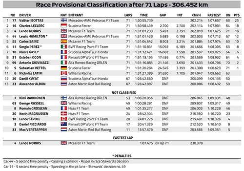 Formula 1'de sezon Avusturya'daki ilk yarışla başladı. Çekişmeli geçen mücadele Mercedes AMG Petronas pilotu Valtteri Bottas'ın zaferi ile tamamlandı. Mercedes'in son şampiyon pilotu Lewis Hamilton'un rakibi ile teması sonrası verilen 5 saniye ve 2 puan cezası, İngiliz yarışçıyı klasmanda iki sıra geriye düşürdü. Hamilton podyum dışında kalarak 4'ncü oldu. Dört aylık zorunlu aradan sonra yeniden asfalta çıkan F1'de, Mercedes ile RedBull takımlarının rekabeti dikkat çekti. Ferrari'nin genç pilotu Lecleric'in podyumda 2'nci sırada finiş gördüğü Avusturya GP'sinde Vettel'in damalı altından ancak 10'ncu sırada geçmesi dikkat çekici bir diğer sonuç oldu. Norris ile podyum yakalayan McLaren takımı'nın diğer genç pilotu Carlos Jr 5'nci tamamladığı yarışta gelecek vaad etti. F1'de sezonun ikinci yarışı gelecek hafta yine Avusturya'da yapılacak. | 7 Temmuz 2020 : 07.30