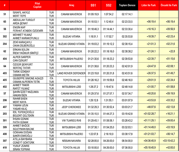 İkinci günün ilk yarışın ise (prologe sonrası) ikinci etabı olan 72.68 km’lik Corendon etabının ilkinde İsrafil Akyüz-Mert Tepe Maverick X3 R’ları ile 1saat 9dakika 19.9 saniyelik zamanlarıyla damalı görerek aynı etapta kendilerinden 1,5 dakika daha geç zamanla etap finişşne ulaşan Abdullah Turgut-Arda Şenay’dan liderliği devraldılar. Etabın ikinci geçilişinde de e hızlı isim değişmedi ve bu kez kendi zamanlarından dahi 1,5 dakika daha hızlı zamanla etabı tamamlayan İsrafil Akyüz-Mert Tepe, kendi zamanlarından 2 dakika daha geç etabı tamamlayan Abdullah Turgut-Arda Şenay’ın önünde liderliklerini farkı açarak perçinlediler.