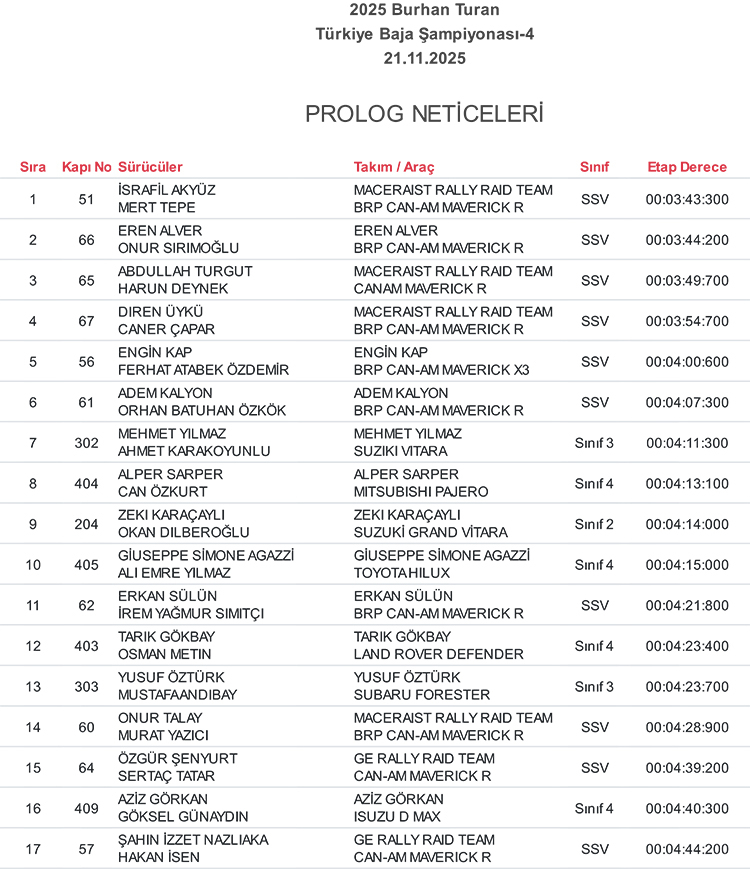 Servis alanı Bolu Kapalı Yüzme Salonu otoparkında kurulurken, seremonik start Bolu14 AVM önünden verildi. 26 Ekibin kayıt yaptırdığı yarışta ilk gün (bugün) seremonik start sonrasında Bolu Üniversitesi ve Bolu Devlet Hastanesi civarında 4,2 km’lik prologe (sıralama) etabı yapıldı. Maceraist brasndingli Maverick R aracıyla etabın 3.43.3 zaman yapan son baja şampiyonu İsrafil Akyüz-Mert Tepe ikilisi (üstte), günün sonunda yarın parkura ilk çıkma hakkını elde ettiler. Ankaralı Eren Alver-Onur Sırımoğlu 9 salise farkla en iyi 2’nci zamanı yaparlarken; Mega Metal brandingli R ile Abdullah Turgut-Arda Şenay (altta) ise artı 5.5 saniye farkla 3’ncü zaman ulaştı. Baja Bolu yarın (cumartesi) 65 km’lik Aladağ etabı iki kez geçilecek. Yarış pazar günü 58.8 km’lik farklı bir etabın iki kez geçilmesi ile tamamlanacak. Baja Şampiyonası’nın 5’nci ve son ayağı önümüzdeki ay Düzce’de yapılacak.