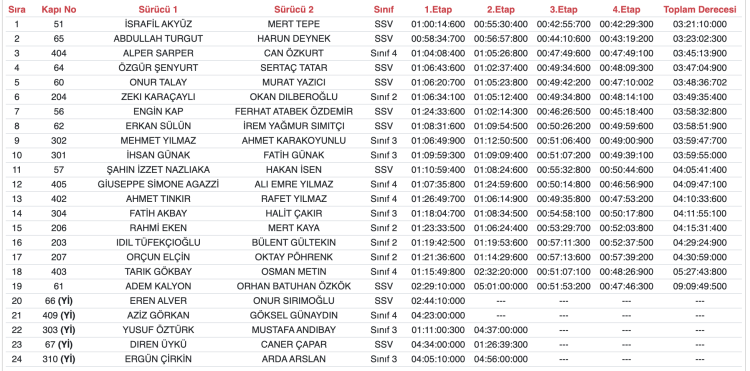 Baja Bolu’da son günün son etabında da finişe ulaşıldı. Mega Metal sponsorlu Maverick X3 R ile Abdullah Turgut-Harun Deynek ikilisi 47,16 km’lik Boloff etabının ikincisini 43.19.2 ile geçti ve toplam zamanlarını 3.23.02.3’e çıkardı. Güne lider başlayan İsrafil Akyüz-Mert Tepe ikilisi etabı ise aynı etabı 42.29.3’lük zamanlarıyla tamamlayarak 3 saat 21 dakika 10 saniye toplam zamanlarıyla Bolu’da da 1 dakika 52 saniye farkla zafere uzandılar… Bolu’da SSV 3’ncülüğünü Özgür Şenyurt-Sertaç Tatar elde ederlerken, otomobillerde Alper Sarper-Can Özyurt birinciliğe uzandılar. Sarper-Özyurt, 19 ekibin finişe ulaştığı yarışta genel klasmanda üçüncü olarak da podyum yaptılar. | Baja Bolu yarışının ayrıntılı haberini ve sporcu yorumlarını Ralli Dünyası Dergisi'nin yeni sayısında bulabileceksiniz.