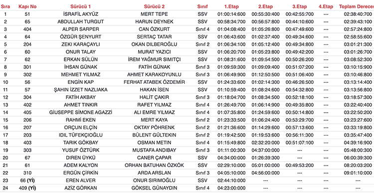 Günün tek etabı olan 47 km’lik Boloff’un ilkinde en iyi zamanı İsrafil Akyüz-Mert Tepe 42.55.7 ile elde ettiler ve aynı etapta 1.14.9 farkla 2’nci en iyi zamanı yapan Abdullah Turgut-Harun Deynek’ten dün 13 saniye farkla devrettikleri liderliği geri aldılar. Otomobillerde etabı en iyi zamanla tamamlayan Alper Serper-Can Öztürk ise genel klasman 3’ncüsü olarak kategorilerinde liderliklerini koruyorlar. Baja Bolu, aynı (Boloff) etabının öğleden sonraki ikinci geçilişinden sonra finiş görecek. Yarışta 3'ncü etap sonrası klasman şu şekilde oldu;