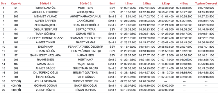 Günün en iyi üçüncü toplam zamanıyla ise Mehmet Yılmaz-Ahmet Karakoyunlu otomobiller kategorisinde 1’ncilik kupasını kaldırırlarken, Alper Sarper-Can Özkurt 52 saniye farkla 2’nci, Zeki Karaçaylı-Okan Dilberoğlu ise artı dört dakika farkla üçüncü sırada finişe ulaştılar. Dört kategoride toplam 20 ekibin mücadele ettikleri yarışta 17 ekip finişe ulaşabildi. Sınıflarında ise, İsrafil Akyüz-Mert Tepe (SSV), Mehmet Yılmaz-Ahmet Karakoyunlu (S3), Alper Sarper-Can Özkurt (S4) ve Zeki Karaçaylı-Okan Dilberoğlu (S2) birincilik kupalarının sahipleri oldular. BAja’nın tek kadın pilotu İdil Tüfekçioğlu, kopilotu Bülent Gültekin ile birlikte Suzuki Vitara’sını klasmanda 16’ncı olarak finişe getirerek kadınlar kupasını kazandı. Yarıştaki tek kadın kopilot olan İrem Yağmur Simitçi de kadınlar ikincisi olarak finiş gördü.