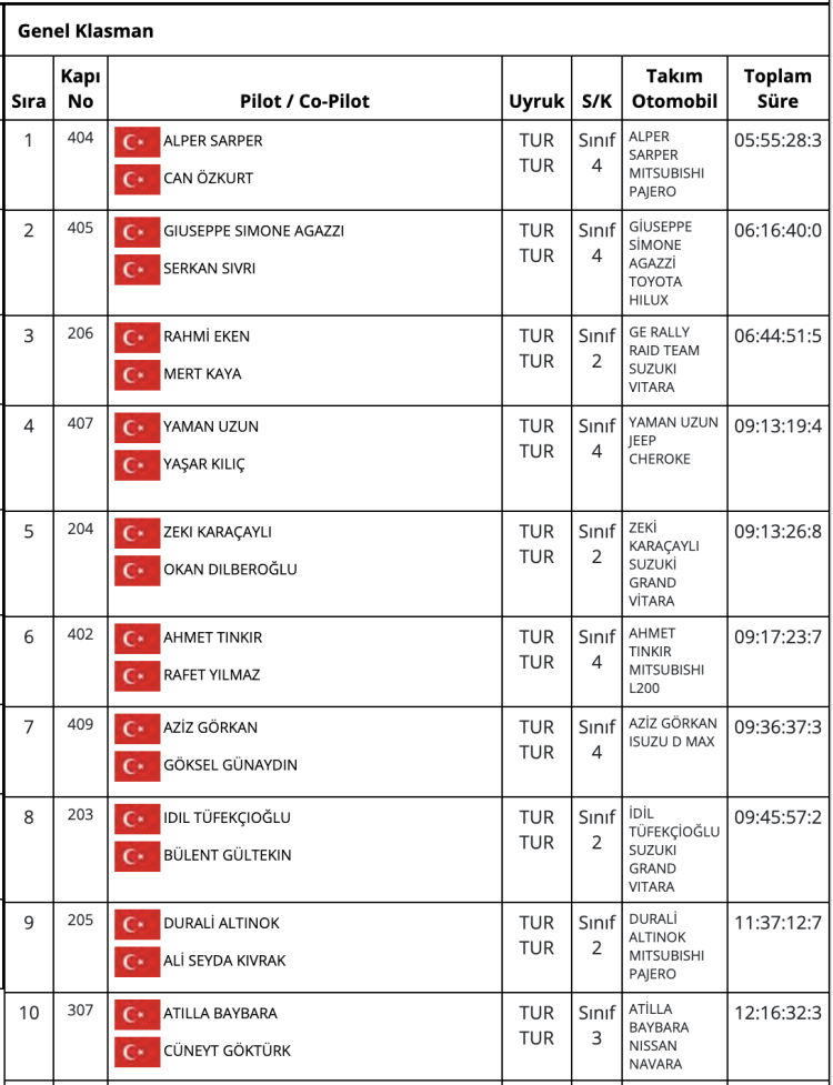 Bursa’da yapılan Baja Resital’de otomobiller kategorisinde Mitsubishi Pajero ile yarışan Alper Sarper-Can Öztürk ikilisi 5s55d28,3s toplam zamanlarıyla kazandılar. Toyota Hilux ile yarışan Türk lisanslı İtalyan bajacı Guisseppe Simone Agazzi’nin Serkan Sivri ile birlikte 21 dakika farkla 2’nci sırada tamamladıkları yarışta, Suzuki Vitara ile mücadele eden Rahmi Eken-Mert Kaya ikilisi de 28 dakika farkla otomobiller kategorisinde 3’ncü olarak podyuma çıktılar. Bursa’daki yarışta otomobiller kategorisinde Fatih Akbay-Halit Çakır (Land Rover), İlayda Hancı-Sevi Akal (L200) ve Okan Kaya-Gamze Kaya (Vitara) yarışı tamamlayamadılar. Bursa’da toplam 21 ekip finiş görüp klasmanlarda yer aldılar. Türkiye Baja Şampiyonası’nda sezonun 3’ncü ayağı üç hafta sonra Antalya’da yapılacak olan BajaPerge. Sezon Düzce ve Bolu Bajaları ile tamamlanacak.