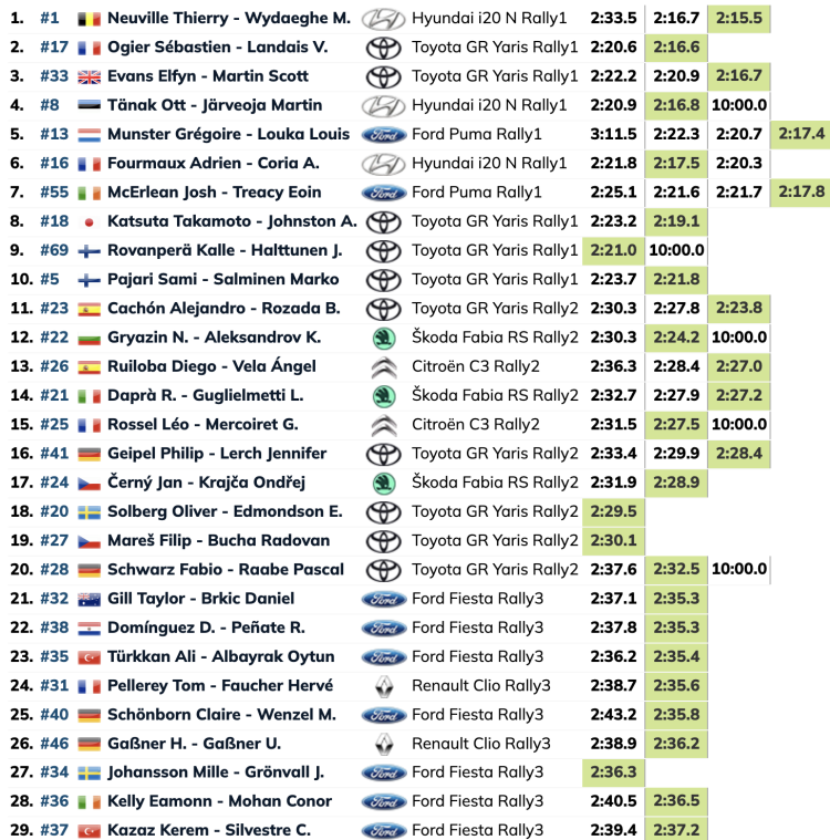 Belçikalı Hyundai i20 N Rally1, 4.57 km'lik ısınma etabının açılış kavşağında dışarı taştıktan sonra hafif gövde hasarı aldı, ancak üçüncü ve son turunda 2 dakika 15.5 saniyelik derecesiyle harika bir toparlanma yaşadı. Neuville, "İlk kavşakta çok geç fren yaptım," diye açıkladı. "Tekerlekleri kilitledim ve virajı almaya çalıştım ama hız biraz fazlaydı. Heyecanlıyız ve sabırsızlanıyoruz. Harika bir başlangıç olmadı ama araç iyi durumda" dedi. Şampiyona lideri Ogier, Toyota GR Yaris Rally1 ile ikinci olurken, ana şampiyona rakibi Elfyn Evans'ın sadece 0,1 saniye önünde yer aldı. Evans'ın sabah boyunca gösterdiği istikrarlı ilerleme, Galli sürücünün hafta sonu üç ülkeyi kapsayan mücadeleye iyi hazırlandığını gösterdi. "Şimdiye kadar harika bir sezon geçirdik," dedi Ogier ve ekledi;