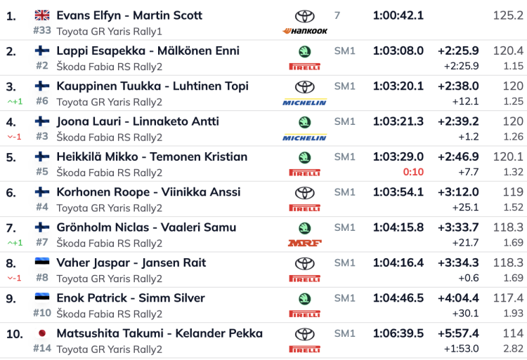 Tamamı karla kaplı zeminde WRC’nin ikinci ayağı olarak iki hafta sonra yapılacak İsveç Rallisi’nin antrenmanı olması için katıldığı Arctic Rallisi’nde tek Rally1 aracını kullanan ve parkura 1 kapı numarası ile çıkan Galli sürücü, ilk beş etapta en hızlı zamanları elde etti ve sadece gece yapılan süper özel etapta geçildi. Toyota pilotunun km başına sadece bir saniyeden biraz fazla gerisinde olan Lappi, şu anda Finlandiya şampiyonasında rakiplerine karşı küçük bir avantaja sahip. Onun arkasında ise Joona, Kauppinen ve Heikkila'den oluşan üçlü grup yaklaşık on saniye geride bulunuyor. Bu kategoride zafer için yarışan isimlerden Korhonen, ikinci özel etapta yaptığı hata nedeniyle podyumdan yaklaşık otuz saniye geride kaldı. Toyota'nın yeni yükselen yıldızı Estonyalı Vaher, Rally2'deki ikinci startında şu anda yedinci sırada yer alıyor. Bugün (Pazar), toplam 121 km’lik altı özel etap daha planlanıyor.