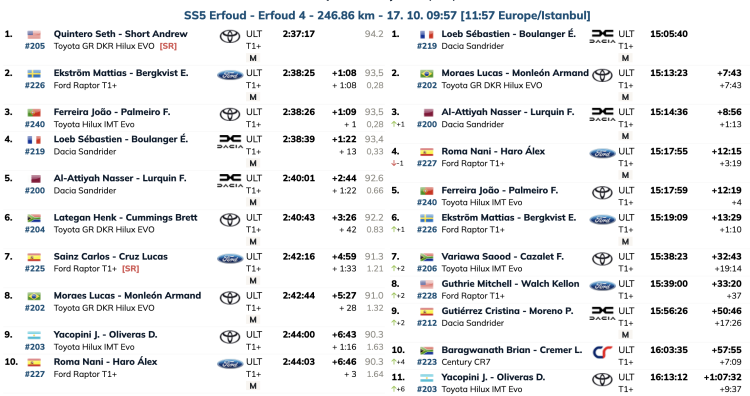 WR2C’de sezonun son ayağı olan Rally du Maroc’ta (Baja Fas) mutlu sona ulaşan isim, Sebastien Loeb oldu. Kariyerinde 9 kez Dünya Ralli Şampiyonluğu bulunan efsane Fransız şampiyon, kopilotu Boulanger ile birlikte 5 gün 1457 km’lik zorlu mücadeleyi Dacia Sandrider’i 15 saat 5 dakika 40 saniyelik toplam zamanlarıyla ve en yakın rakiplerinin 7 dakika 43 saniye farkla tak’a 1’nci olarak çıkardı. Yarışın bugünkü 246 km’lik 5’nci ave son günüde en iyi zamanı ise Toyota Hilux Evo’lu Quintero-Short ikilisi yaparken, Ekstrim ve Ferreira’nın ardından en iyi 4'üncü zamanla günü sonlandıran Loeb, eşsiz kariyerine yeni ve farklı bir zafer çentiği daha atarken, takım arkadaşı Attiyah podyumda son basamakta finiş yaptı.