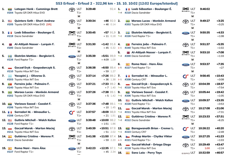W2RC’de sezonun son ayağı olarak önceki gün Fas’ta başlayan ve hafta sonu finiş görecek olan baja yarışında üçüncü gün olan bugün, dün parkurda kaybolarak ciddi zaman kaybeden Henk Lategan en iyi zamanı yaptı fakat O’ndan artı 57 geç bir zamanla günü tamamlamasına karşın efsane ralli şampiyonu Fransız Sebastien Loeb, Dacia Sandrider ile bir gün aradan sonra liderliği geri aldı. Fas’ta Brezilyalı Lucas Moraes Toyota Hilıx Evo ile 3 dakika 25 saniye gibi ufak bir farkla 2’nci, Ford Raptor T1+ ile yarışan İsveçli Mattias Ekström ise 4.33 farkla podyumun son basamağında bulunuyorlar. Rekabetin kızıştığı ve farkların çok azaldığı Rallye Du Maroc’da 4’ncü gün olan yarın 284 km geçilecek. Yarış son gün olan Cuma 216 km’lik etaptan sonra finiş görecek.