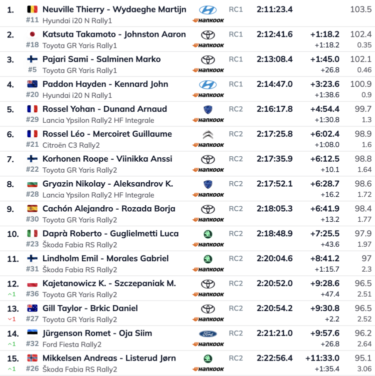 Katsuta'nın sabah seansı daha inişli çıkışlı geçti. SS10'daki güçlü zamanının ardından, Japon sürücü SS11'de özgüvenini büyük ölçüde kaybetti ve liderden 27,5 saniye geriye düştü, ancak son etapta biraz toparlandı. Buna rağmen, şampiyonluk yarışından dolayı baskı altında kalmaya devam ediyor ve önceliğinin artık puan kazanmak olduğunu açıkça belirtti. “Arabayı mutlaka geri getirmem gerekiyor. Durum kolay değil. Arabayı geri getirmek en önemli şey” dedi. Paddon, sezonun sadece ikinci startında özgüvenini artırmaya devam etti ve liderin 1 dakika 35.8 saniye gerisinde, genel klasmanda dördüncü sıradaki yerini korudu. Yeni Zelandalı sürücü, yarışın başlarında bulanık zemin koşullarında tam olarak rahat değildi, ancak hatasız bir tur ve Fourmaux'nun yarıştan çekilmesi, pozisyonunu önemli ölçüde güçlendirdi. Fourmaux'nun rallisi ise SS12'de aniden sona erdi; sağa doğru bir virajda geniş döndü ve Hyundai i20 N Rally1'inin sol arka süspansiyonuna hasar verdi. Fransız sürücü zaten cuma günkü lastik patlamasından kurtulmaya çalışıyordu ve yarıştan çekilmesi Rally1 katılımcı sayısını daha da azalttı. Öte yandan, M-Sport Ford'un genç pilotu Josh McErlean zorlu bir sabah geçirdi. SS10'da küçük bir elektrik arızası nedeniyle etabı yarıda bırakmak zorunda kaldıktan sonra yedi dakikadan fazla zaman kaybetti, ancak yarışına devam edebildi. Üst düzey yarışçıların sayısının azalmasının ardından, Rossel genel klasmanda beşinci sırada yer alarak WRC2'nin liderliğini sürdürdü; Lancia takım arkadaşı Gryazin ve kardeşi Rossel de genel klasmanda ilk 8 içinde yer aldı.