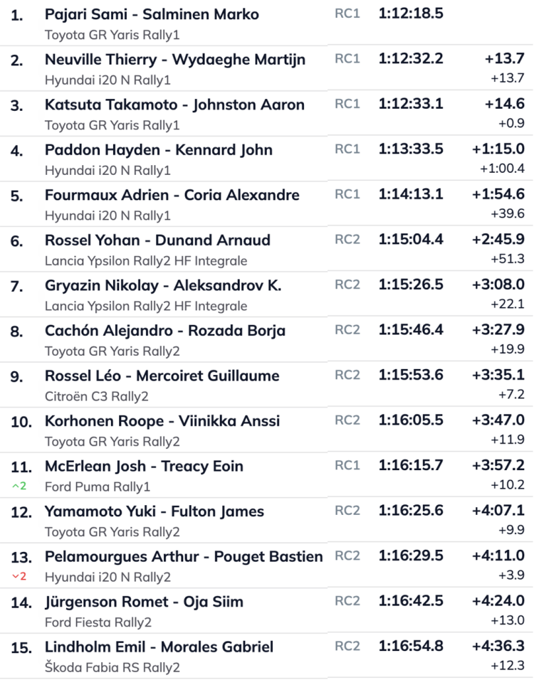 Her şey SS3, Beram-Cerovlje etabında altüst oldu. Evans, sağ virajı yanlış değerlendirdikten sonra kontrolden çıktı ve dramatik bir şekilde yarışı sonlandırarak arkasındakilere fırsat yarattı. Bu olay, Solberg'in rallisinin açılış etabında sona ermesinden sadece bir etap sonra gerçekleşti; İsveçli sürücü, bir sete çarptıktan sonra GR Yaris Rally1'ini spin attırarak yoldan çıkarmıştı. Pajari ise, etrafında kaos yaşanırken soğukkanlılığını korudu. Fin pilot, sürüşünden tam olarak memnun olmadığını kabul etmesine rağmen, açılış etabında ve SS2'de ikinci en hızlı isim oldu. Evans'ın SS3'teki düşüşü onu liderlik tablosunun zirvesine taşırken, SS4'te elde ettiği etap zaferi Katsuta ile arasındaki farkı daha da açtı. Pajari, " ilk etaptan sonra beklediğim pozisyon bu değildi, ama şikayetçi değilim. Diğer etaplarda daha iyi olabileceğimi düşünüyorum. Kolay değil, ama sert lastikle gitmek için iyi bir planımız olduğuna güveniyordum" dedi.