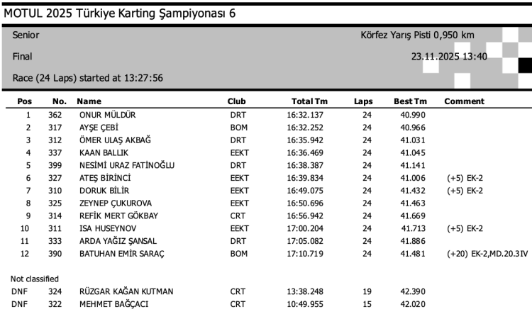 14 Kartingçinin mücadele ettiği senior kategorisinde Onur Müldür, 16 turluk mücadeleyi 16.32.137’lik toplam zamanıyla 1’nci olarak tamamladı. O’nu 0.8 saniye farkla Ayşe Çebi takip ederken, Ömer Ulaş Akbağ kategoride podyum yaptı. Ek 2’den +5 saniye ceza alan Ateş Birinci 6’ncı olurken, benzer cezaları alan Doruk Bilir 7 ve İsa Hüseynov 10’ncu oldular. Batuhan Emir Saraç, ek 2’nin yanısıra madde 20.3IV’den toplam 20 saniye ceza alarak 12’nci bitirirken, Rüzgar Kağan Kutman ve Mehmet Bağçacı yarışı tamamlayamadılar. Kartingte mini kategoride ise Ali Sururi Akgün birinci olurken, Uygar Arslan Birgili ve Süleyman Cem Karaömür podyum yapan isimler oldular. Master kategorisinde ise Gün Taşdemir, Murathan Gür ve Murat Can Eğilmez podyumu paylaştılar. Junior kategorisinde de Turhan Erin Ünlüdoğan birinci, Demir Sağım ikinci ve Rüzgar Tırınk üçüncü oldular.