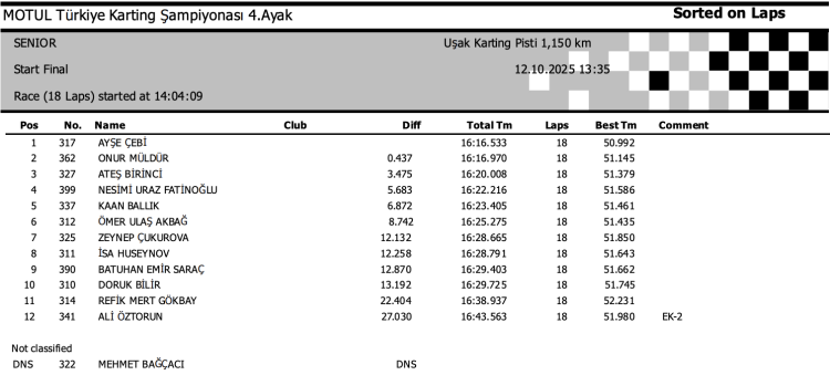 Uşak'ta yapılmakta olan Türkiye Karting Şampiuonası'nın 4'ncü ayağında senior kategorisini kadı sporcu Ayşe Çebi kazandı. Onur Müldür'ün 2'nci olduğu senior'da Ateş Birinci (fotoğrafta) 3'ncü olarak damalı görerek podyumu tamamladı.