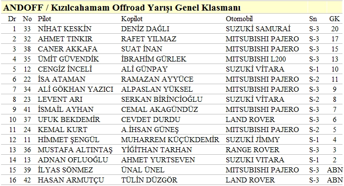 Türkiye Offroad Şampiyonası, Kızılcahamam?da start aldı. Ankara offroad ve Doğa Sporları Kulübü (Andoff) tarafından düzenlenen yarışta, İstanbullu yarışçılar podyumu ele geçirdiler. Geçtiğimiz sezonun ikinci yarısında yarışlara ara veren Nihat Keskin, ?yeni? kopilotu Deniz Dağlı ve offroad severlere görsel ziyafetler çektiği ?eski? emaktarı Suzuki Samurai?si ile yine ve parkurlara geri dönüşünü yeni bir zafer ile taçlandırdı. Keskin, ilk gün sonunda ele aldığı liderliği ikinci günün sonunda da bırakmadı ve sezonun ilk yarışından tam puanla çıktı.