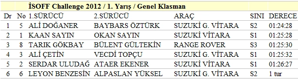 Suzuki Vitara ile yarışan Okan Sayın-Kaan Sayın yarışı ikinci tamamladılar. İsoff yarışçılarından Okan Sayın bu yarışta sol koltuğu oğlu Kaan Sayın?a bırakıp co-pilot olarak yarıştı. Damalı bayrağı 3?ncü sırada göğüsleyen ekip ise Range Rover ile yarışan Tarık Gökbay-Bülent Gültekin ekibi oldu. Sadece 6 ekibin finiş bayrağını görebildiği bu zorlu yarışta, Ali Çetin-Vecdi Topçu 4?ncü, Serdar Uludağ-Ataer Ekener 5?nci ve Leyon Benzesin-Alpaslan Yüksel 6?ncı oldular. 2012 yılına yayılmış 3 ayaktan oluşan İsoff Challenge?ın Eylül ve Ekim ayında koşulacak ayakların ardından yıl sonunda şampiyon belirlenecek.