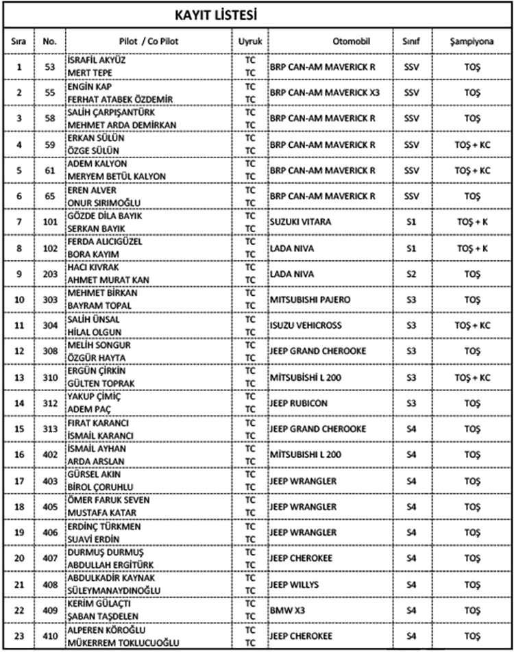 Türkiye Offroad Şampitonası'nda Samsun'un Vezirköprü ilçesinde yapılacak olan 4'ncü ayağı için beş kategoride toplam 23 ekip kayıt yaptırdı. Hafta sonu gerçekleştirilecek olan yarışta SSV'lerin rekabeti yarışa yine renk ve heyecan katacak.