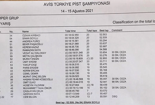 2021 Avis Türkiye Pist Şampiyonası’nda sezonun ikinci haftası ilk yarışları yapıldı. Körfez Yarış Pisti’nde gerçekleştirilen yarışlarda süper grup'taki mücadele keyifle izlenirken, maxi grup Audi’lerin zirveyi paylaşmaları ile tamamlandı. Sıcak, güneşli bir günde ve kısıtlama olmamasına karşın seyircisiz gerçekleştirilen yarışlarda Mini, Opel, VW Golf ve Fiat olmak üzere 4 farklı markada toplam 22 sporcunun verdiği 20 turluk Süper rekabetinde VW Golf ile yarışan Ozkan Kırbacı (34) 18 dakika 02 saniye 950 salise toplam zamanıyla damalıyı ilk gören isim oldu. Opel Corsa ile Sinan Soylu (54) 52.509’lük zamanıyla günün en hızlı turuna imzasını atarken, 1,4 saniye farkla süper rekabette 2’ncilik kupasını kaldırdı. Opel Corsa ile yarışan İtalyan sporcu Andrea Furci (44) süper rekabetinin podyumunda yer alan üçüncü isim oldu. Yarışma komiserleri, yarış sonunda Vedat Ali Dolakay, Metin Çalışkan, Hasan Fehmi Köseoğlu, Muhammed Taha Ömür 30’ar, Murat Engin'e 60, Ümit Erdim ile Ümit Ülkü'ye 90’ar saniye zaman cezası verdi. Cem Bilgin 13’ncü turda diskalifiye edildi. TPŞ 2’nci haftasının 2’nci yarışı yarın (Pazar) yapılacak. Maxi grupta ise pistlerin yeni takımı AMS, çifte Audi ile zayıf rakiplere karşı fark atarak 1-2 podyum yaptılar. Clio ile yarışan Süleyman Berkel, sol ön lastik problemi yaşayarak rekabetten erken koptu. Maxi grupta da haftanın ikinci yarışı da yarın Körfez Yarış Pisti’nde yapılacak. | Aydın Hoşgör, Ralli Ajansı, Körfez, 14 Ağustos 2021 : 20.45