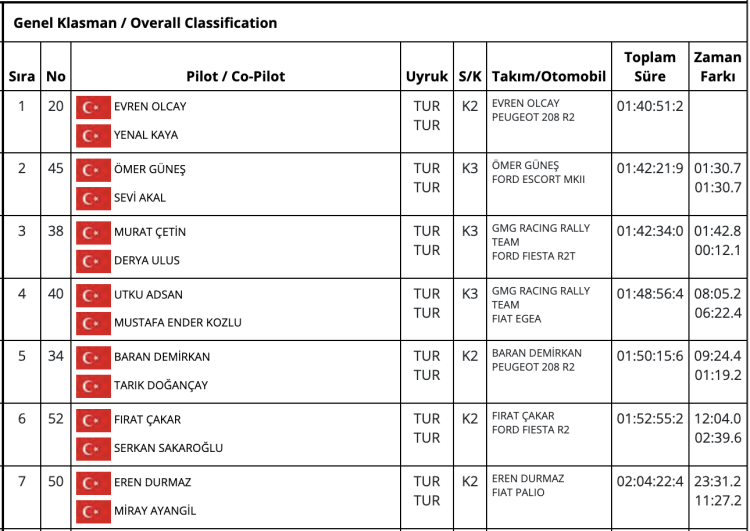 Türkiye Ralli Şampiyonası’nın 6’ncı yarışı olarak 15-16 kasım tarihlerinde gerçekleştirilen 45.İstanbul Rallisi’nde koşulan Berç Arhanyan Türkiye Ralli Kupası’nı 1 saat 40 dakika 51.2 saniyelik toplam zamanlarıyla Peuegot 208 R2 ile yarışan Olcay Evren-Yenal Kaya ikilisi kazandı. 1,5 dakika farkla Ford Escort Mk2 ile Ömer Güneş-Sevi Akal’ın 2’nci oldukları BATRK’da arto 12,1 saniye farkla da Fiesta R2T’leri ile Murat Çetin-Derya Ulus (üstte) podyum yaptılar. Egea 1.4 T-Jer ile Utku Adsan-M.Kozlu’nun podyumun ardından 4’ncü olarak tamamladıkları BATRK’ta 8 ekip finişe ulaştı. BATRK, önümüzdeki ay son ralli olan Kocaeli Rallisi ile tamamlanacak.