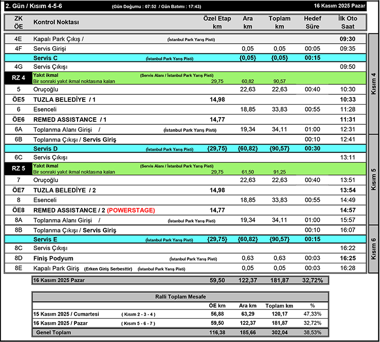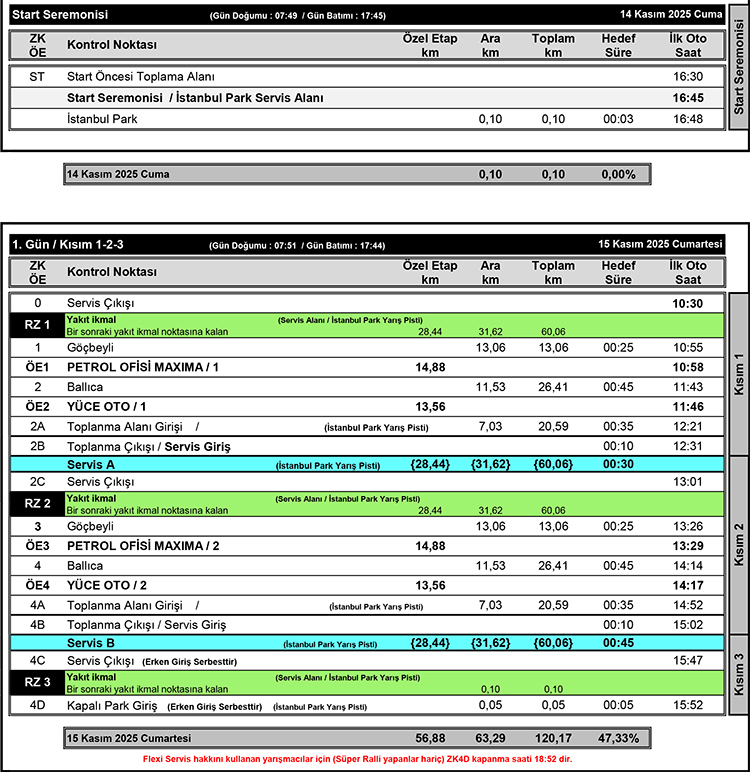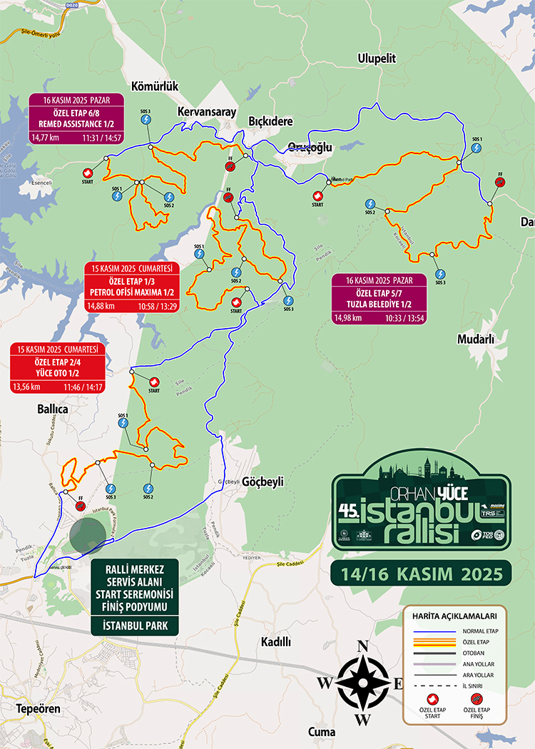 Türkiye Ralli Şampiyonası'nın 6'ncı ayağı olarak hafta sonu İstanbul'da yapılacak olan Orhan Yüce İstanbul Rallisi'nin haritaları ve itienary tablosu belli oldu. Cuma günü saat 16.45'de İstanbul Park pistinin servis alanından startı verilecek olan rallide ilk gün (cumartesi) toplam 56,88 km'si olan iki farklı özel etap, ikinci gün olan (pazar) ise yine toplam km'si 59,5 km olan iki farklı etap ikişer kez geçilerek ralli tamamlanacak. İki günde ekipler 8 özel etapta zamana karşı mücadele verecekler