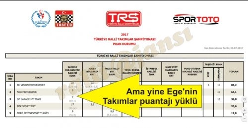 Bu hafta ise federasyonun resmi sitesinde puantajlar incelendiğinde durumda bir değişme gözlendi; Ege Rallisi ile ilgili puanlar takımlar klasmanında işlenmiş durumda ama pilotlarda ise hala Ege Rallisi'nin sütunları boş duruyor.