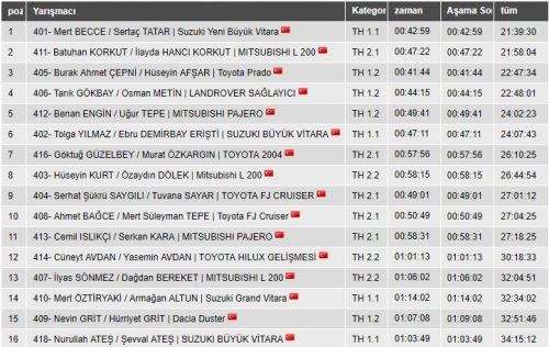 Alper Akgün 2013 Ege Kupası'nda da kupa kaldırmıştı (Arşiv)Aydın Otomobil Sporları Kulübü tarafından İzmir'in Sasalı Kent Ormanı'nda gerçekleştirilen Sprint İzmir Rallisi'nde 'saliseler' konuştu. Honda ile yarışan yarışan Alper Akgün-Mehmet Yaman ikilisi 4 etap sonunda 10.57.1'lik toplam zamanıyla 1'nci olurlarken, Palio ile Cem Doğrular-Cem Çakal ikilisi 5 salise farkla ve 10.57.6'lık toplam zamanlarıyla 2'nciliğe ulaştılar. VW Golf GTI ile Nüvit Karakaşlı-Erdüment Can Tolun ikilisinin 11.11.2'lik toplam zamanlarıyla 3'ncü oldukları İzmir Sprint Rallisi'nde 21 ekip start aldı, 3 ekip finiş göremedi. K1'de Nüvit Karakaşlı-Erdüment Can Tolun, K2'de Alper Akgün-Mehmet Yaman, K3'te Cem Doğrular-Cem Çakal sınıf 1'ncileri oldular. | 31 Ağustos 2019 : 06.45Tabloyu büyütmek için burayı tıklayabilirsiniz.