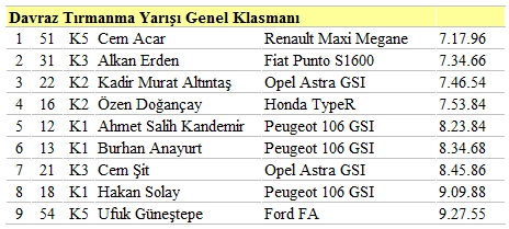 Davraz Tırmanma Yarışı?nda Kategori 1?de İstanbul?dan Ahmet Salih Kandemir (Peugeot 106 GTI), Kategori 2?de Ankara?dan Murat Altıntaş (Opel Astra GSI), Kategori 3?te İstanbul?dan Alkan Erden (Punto S1600), Kategori 4?te Antalyalı İbrahim Şendil (Subaru Impreza), Kategori 5?te de İstanbul?dan Cem Acar (Renault Maxi Megane) günün 1?ncilik kupalarını ve puanlarını kazandılar. Türkiye Tırmanma Şampiyonası?nda sezonun üçüncü yarışı 27 Mayıs?ta Nazilli?nin İsabeyli Beldesi?nde yapılacak. Ege Otomobil Sporları Kulübü tarafından düzenlenecek olan Şırlan Tırmanma Yarışı?na İzmir, İstanbul, Ankara ve Bursa?dan yirminin üzerine katılım olması bekleniyor.