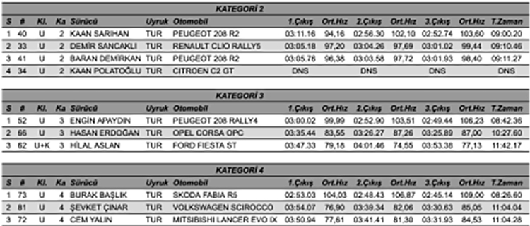 4 Sporcunun start aldığı K1’de Peugeot 208 R2 ile Kaan Sarıhan, 9 dakika 20 saniye ile en iyi toplam zaman ulaştı. Eski ralli şampiyonlarından Adnan Sarıhan’ın oğlu olan Kaan, kariyerinin ilk 1’nciliğini Darlık’ta elde etti. Clio Rally 5’li Adapazarlı bir diğer genç sporcu Demir Sancaklı’nın 10,2 saniye farkla 2’nci olurken; K2’de Peugeot 208 R2 ile yarışan Baran Demirkan ise podyumu tamamladı. GP Garage patronu Süheyl Polatoğlu’nun oğlu Kaan Polatoğlu, son ayakta Citroen C2 GT’sinde motor problemi yaşayınca günün ve yarışın tek abandonesi oldu.