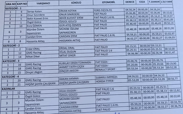 Toplam sekiz sporcu ile en kalabalık kategori olan K1’de podyum Erkan Kotan (Fiesta R1), Onur Sınırdere (Palio) ve Bekir Kuvvet Erim (Palio) tarafından paylaşılırken, üç sporcunun mücadele ettiği K2 podyumu Erdal Oral (Palio), Hilal Olgun (Palio 1.6) ve Mithat Diker (Palio) tarafından paylaşıldı. K3’de Kubilay Ersin Türkmen’in (Palio) ardından Ahmet Fatih Çiçek (Egea) ve Dinçer Akgün (Renault) sıralanırken, K4’de Hakan Akman (Impreza) ve Haşim Şahin Çalışkan (Typer) podyuma çıktılar. Kadın sporcular rekabetinde ise GMG Racing’in Palio 1.6’sı ile Hilal Olgun, Ege Asal Motorsport’un Palio’ları ile yarışan Özgül Gülcü ve Münibe Özlem Sapansüren’in önünde kadınlar kupasını kazanan isim oldu. İki Ege kulübü AYOSK ve İOSK’un düzenledikleri otokros kupalarının sezon galaları önümüzdeki ay İzmir’de gerçekleştirilecek.