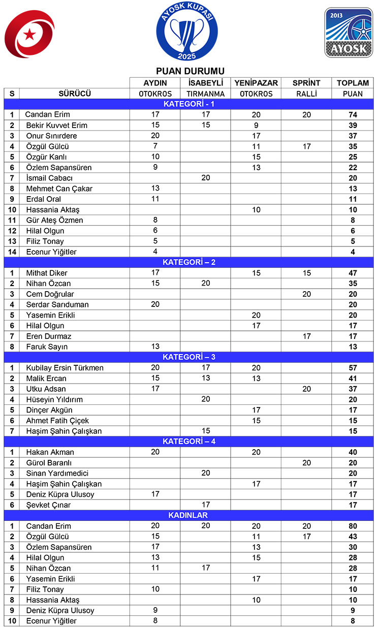 2025 Ayosk Ege Kupası'nda K1'de ve kadınlarda Candan Erim, K2'de Mithat Diker, K3'de Kubilay Ersin Türkmen ve K4'de Hakan Akman sezonu 1'nciliklerle kapadılar.