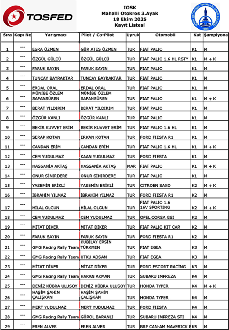 Başkanlığını İzmirli duayen rallici Mithat Diker'in yaptığı İzmir Otomobil Sporları Kulübü (İOSK), hafta sonu Menemen'de gerçekleştireceği Ege Kupası otoros yarışı için tam 29 kayıt aldı. Aynı hafta sonu İstanbul'da ulusal Darlık tırmanma yarışına sadece 13 sporcu kayıt yaptırırken, Ege kupasının mahalli otokrosuna 29 kayıt ulaşması dikkat çekici bir sonuç oldu. Cumartesi ve pazar günleri iki farklı otokrosun yapılacağı Ege Kupası, Aydın'daki otokros ve bir mahalli ralli ile tamamlanacak.